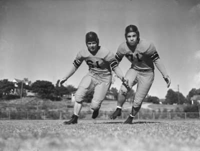 The Polytechnic High School football team has one of the toughest offensive lines of any school in the District 7AA. Two reasons for this are Kenny Baker, 61, and Robert Wilson, 71. The powerful guard combination ranks as two of the most promising players in the Interscholastic League. Baker weighs 190-pounds and Wilson weighs 195. They are shown practicing their blocking techniques, dressed in their football uniforms.