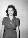 Star-Telegram Junior photos. Betty Vickers of the City Circulation Department. "Betty Vickers, new addition to the front desk in City Circ, Poly grad, '42, wears ring that signifies her heart belongs to former Employe David Naugle. Lucky David!". Ms. Vickers is located in the center left of the photograph. She is wearing a dress that has buttons from the waist up and has pockets on either side of the chest. Around the waist of her dress is a belt that is fastened and is the same material as the dress she wears. The buttons of the dress are large and shiny. She has her arms down at her sides, a necklace around her neck with only the chain visible, and pin on her left breast pocket that appears to say Navy. Ms. Vickers has dark curly hair and appears to have her hair half up and half down. She is looking directly at the camera and is smiling broadly. In the background a concrete wall can be seen.