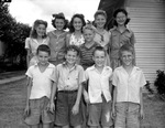 Polio fund collectors. Front row, left to right, Robert Cowley, Jerry Jolly, Don Jully, Ray Cowley and J. D. Brannon; back row, Melba Biggs, karlene Cowley, Rose Ellen Lyle, Frances Gibbs and Myrlene Richardson.