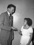 Polio fund collectors. Sally Ann Shultz handing money to T. E. Graham.