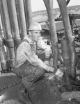Oil fields. E. J. Fleetwood, helper, is working in his working uniform and hardware hat. His uniform is covered in oil. Published in Fort Wort Star-Telegram, evening edition, September 19, 1943.