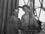 Oil Fields. Left to right, N. A. Widmayer, and Thurman Foster. Both men outside in their working clothes, is covered in oil stains standing side by side. Published in Fort Wort Star-Telegram, evening edition, September 19, 1943.