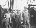 Oil Fields. Left to right, Jack Dickson, W. D. Lewis and G. B. Warneke. The men in their working hats and outfits are outside in the oil fields, standing side by side by machinery and equipment. Published in Fort Wort Star-Telegram, evening edition, September 19, 1943.
