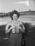 Oil fields. Joyce Brewer, daughter of Mr. and Mrs. L. R. Brewer with arms full of canned home-grown fruit. Published in Fort Wort Star-Telegram, morning edition, September 12, 1943.