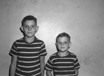Many Polio Patients Now Get Extensive Treatment: Infantile paralysis patients now require more extensive treatment than they did in the earlier stages of the disease. W. M. Massie, chairman, and A. B. Vera, secretary-treasurer of the Tarrant County Infantile Paralysis Association, are gratified that contributions are still coming in to the emergency fund. Among most recent contributors to the fund are Billy Harris, 11, and Jimmy Harris 7, of 1704 East Leuda, $9.03; Jimmy McKinney, 1634 East Leuda, pupil at R. Vickery School, $14.64. Harris brothers, left to right Billy and Jimmy are pictured here. Two boys are standing side by side, facing front and smiling. Both wearing stripped shirts. Published in The Fort Worth Star-Telegram evening edition, September 11, 1943.