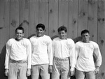 The Texas Christian University Horned Frogs are preparing for the 1943 football season. Some of the new faces to the gridiron, left to right, are Billy Hale, Arthur Teixeira, Duke Bolen and James Lucas. Teixeira will get a majority of his snaps at right halfback. Lucas is a 160-pound triple threat player out of the backfield. The Pecos, Texas, native promises to be one of the key offensive threats this season. The players are shown standing against a fence, dressed in practice uniforms.
