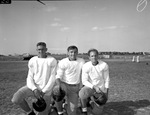 The Texas Christian University Horned Frogs are preparing for the 1943 football season. There are nine freshman on the roster and only one returning letterman from the 1942 season. Some of the new faces to the gridiron are Dick Finningim (center) and Don Culwell (right). An unidentified player is at the left. The players are shown kneeling on the football field, dressed in their practice football uniforms.
