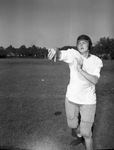 Guy Proctor is a fullback on the Paschal High School football team. He was a letterman during the 1942 season and will be one of the most experienced players on the 1943 squad. Proctor will handle running the backfield in addition to lugging the ball and passing. He is shown throwing during practice, dressed in a practice uniform and helmet. The Panthers are preparing for their opening game against the Denton Broncs.