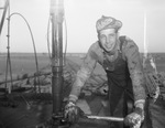 Crew members at the Humble Oil and Refining Company No. 1 Dodson #1, prospective discovery in Hardeman County three and a half miles Chillicothe. G. D. Norwood, derrickman. A man in work clothes; gloves and hat, working on an oil well drilling rig.