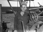 Crew members at the Humble Oil and Refining Company No. 1 Dodson #1, prospective discovery in Hardeman County three and a half miles from Chillicothe. G. D. Norwood, derrickman. A man on oil drilling rig holding onto a wheel with a car behind him.