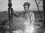 Dodson #1, Humble Oil Company, near Chillicothe. Clyde Seigler, backup man. A man is standing on an oil well drilling rig. His right hand is on a piece of machinery. There are pipes in the background laying on the ground.