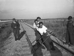 Mexican Nationals. Group working on Texas and Pacific Railroad Company tracks, left to right, Moises Morales, Gabriel Mercado and Robert Navarro. There are two men supervising the three men working on the railroad tracks.