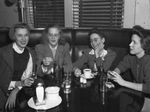 Star-Telegram Junior. Left to right: Eleanor Wilson, Flo Beheler, Ruth Castillon and Rosalyn Graves. The women are sitting at a round booth in front of a window covered with Venetian blinds, laughing and having a good time. They are enjoying a Coca-Cola and coffee. Miss Wilson is wearing a light colored silky blouse covered by a shaggy chenille button vest and a head scarf around her hair with a pencil poking out over her ear. She has a herringbone overcoat over her shoulders and a silver bracelet. Miss Beheler is wearing a herringbone overcoat and a striped blouse with a light plain collar, is wearing eyeglasses and smoking a cigarette. Miss Castillon is dressed in a blouse and garment with knit ribbed sleeves and back and a fabric front. She is wearing eyeglasses and a ring on each hand, is drinking coffee and has a cigarette in her hand. Miss Graves is wearing a buttoned up cardigan sweater, is holding a pack of matches, and preparing to light a cigarette.