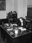 Star-Telegram employee Katrine Deakins at her desk as she talks on the telephone. There are several items on her desk, including a lamp, a potted plant, notes, an ink blotter pad, and two telephones.