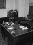 Star-Telegram employee Desk. Shot of Katrine Deakins' desk. There is a desk lamp, two telephones, several notepads, and an ink blotter pad. Behind the desk are two filing cabinets with books on top of them.