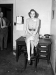 Star-Telegram pin-up girls: Frances Tolar. In the photograph, Frances is sitting on a desk with her left leg on a stool in front of her and her right leg in front of the stool. She has one hand crossed over the other and both hands are placed on her lap. She is wearing a knee length dress with buttons going down the center and a belt at the waist. On her dress, there is a pocket at the top on both sides of her chest. There is a handkerchief in the left pocket and two brooches attached. There is a telephone placed on the desk and some newspapers. On the wall, there is a calendar and a frame. There is an unidentified man standing at the door on the left with his left hand on his waist. He is wearing a suit, an inner shirt, and a tie. The desk has drawers and a shelf with a typewriter and beside the desk there is a trash can.
