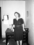 Star-Telegram pin-up girls: Mary Belle Lefler. Mary is be standing in front of a desk with her hands placed to the side on the desk. She is wearing a knee length dress with buttons at the center of the top with a tiny belt on her waist, and a bracelet on her left arm. There is a telephone on the desk and other miscellaneous items. On the wall behind Mary, there is a calendar while on the wall beside her, there is a framed photograph of an unidentified man. Beside the desk, there is a trash can