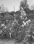 Mrs. W. O. Wear standing in a garden of irises. She is wearing a dress and eyeglasses and is holding a bundle of the flowers in her hands. Mrs. Wear is a prize-winning iris grower and has about 800 varieties of irises in her gardens.