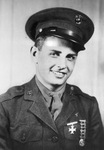 Marine Private Duke M. Baker is one of six sons to Mrs. George M. Baker, of Marfa, Texas. Baker is shown dressed in military uniform. with two badges and marine corps eagle pin. Published Fort Worth Star-Telegram Morning Edition April 11, 1944.