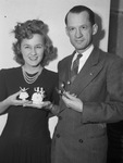 Ernest F. Sellars and his daughter, Mary Bena Sellars, collectors of figurines and rare spoons. Mr. Sellars is in a doubled-breasted suit with plaid tie and small decorative pin on his lapel.. He is holding up 3 rare spoons from his collection.Miss Sellars, daughter to Mr. and Mrs. Ernest Sellars, 3133 Walbash, is wearing a drop-waist dress, a three-strand pearl necklace and hat made of feathers. She is holding two figurines from her collection. One figure is of a ballerina and the other is of a couple dancing. Published Fort Worth Star-Telegram Morning Edition April 9, 1944.