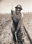 Wilbarger County, Texas, Mains oil field. L. M. Oden, roustabout for Texas Company. Mr. Oden is shown outside pushing a shovel into the ground. He is wearing a helmet, a long-sleeved shirt and a pair of trousers while standing in a thin, long hole that he is digging up. Around him is the rest of the field that is made up of dirt and patches of grass. In the distance, some building can be seen including a tall tower.