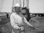 Wilbarger County, Texas, Mains oil field. T P. Jones, Electra, team contractor on the Texas Company. Mr. Jones is shown standing outside in the field with some other equipment and another worker digging into the ground. He is wearing a long-sleeved shirt, trousers, gloves and a sun hat. He appears to be holding on to two straps. Further into the distance is an oil rig.