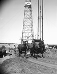 Wilbarger County, Texas, Mains oil field. The Jones teams at work. Shown is the Jones team working under an oil rig with different equipment. In the foreground are three horses that are linked together by rope, following a dirt path. Around the scene is dirt and rocks with few patches of grass. The oil rig stands tall with two other small poles accompanying it.