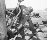 Wilbarger County, Texas, Mains oil field. Claud Case, helper for Galloway Drilling Company. Mr. Case is shown helping out another worker lift up a large bit of metal. He is wearing a long-sleeved shirt, a pair of jeans and a wide brimmed hat and is smiling widely. He appears to be standing on a few planks of wood, while scattered pieces of metal and equipment are behind him.