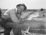 Wilbarger County, Texas Mains oil field. L.A. Henning, roustabout for Texas Company. Mr. Henning is shown standing outside with his leg propped up on a stack of materials and his elbow resting on his knee. He is looking towards the camera wearing a helmet, a pair of overalls and a long-sleeved shirt. Henning appears to be smiling slightly, while behind him a long bit of land is shown to be dug up.