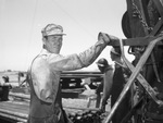 Wilbarger County, Texas, Mains oil field. Buster Folmar, operator. Mr. Folmar is shown standing outside with stacks of various materials behind him. He is wearing a long-sleeved shirt, a pair of overalls, a hat and a pair of gloves. He is looking off to the side while resting his hand on the machinery in front of him. Behind him are a couple of other workers dealing with other equipment.