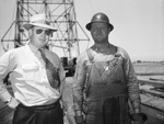 Wilbarger County, Texas, Mains oil field. H. T. Westbrook (right|| roustabout of J. D. Huffaker, with Frank Wood, contractor. The duo is shown standing outside in front of an oil rig and some supplies. Westbrook is wearing a long-sleeved shirt, a pair of overalls and a helmet. Mr. Wood is wearing a brimmed hat, a buttoned up shirt with a tie and pair of trousers. He is also wearing a pair of tinted sunglasses. Wood has his hand on his hip while Westbrook's gloved hands are at his side.