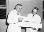 The Red Cross is offering home nursing courses for men. Dan Weaver and William Green are demonstrating the proper technique to reading a thermometer. Mr. Weaver is reading the thermometer while Mr. Green holds a poster board with a larger representation. Mr. Weaver is wearing a striped dress shirt, a necktie, and an apron. Mr. Green is dressed in a button-up shirt, necktie, and an apron. There are two windows along the brick wall.