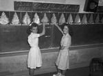 Saratoga School bond buying activities. Betty, left, and Billy Coward, pointing to their bond and stamp purchase records. The two girls are standing in front of a chalk board and each pointing at cutout pine trees with starts hung on the wall.