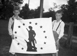 Saratoga School bond buying activities. Eugene Moran, left, and Chester Ewings, show Treasury Department Flag that flies over the school. The boys are holding a flag with a figure that surrounded by stars.