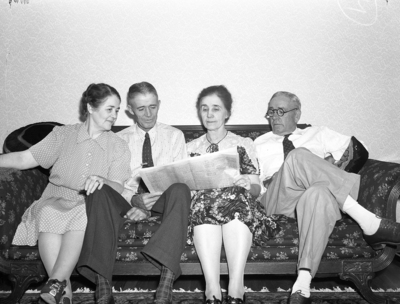 Image shows from Left to right, Mrs. S. E. Bartley, Tom Rayburn, Miss Lou Rayburn and Will Rayburn, all of Bonham, Texas. Four of the speaker's brothers and sisters are shown reading news of Sam. They and all the home folks expected him to be speaker one day. Published in the fort worth Star-Telegram morning edition September 18, 1940