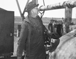 Oil fields. W. R. Simpson, driller. Mr. Simpson is standing next to a large pipe. He's wearing overalls and a hat. His left hand is on a valve.