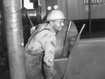 Oil fields. R. A. Armidage, driller, is hunched over in front of a mechanical device. He's wearing a hard hat.
