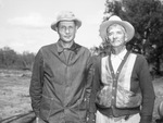 Oil fields. Left to right, F. C. Bloodworth, land owner and W. C. Hanna, both are owners of the well. The two men are standing outside. Both are wearing hats and coats.