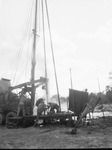 Oil fields. Hanna Heirs well 3#1 when the plug was drilled. Four workers are on the oil rig.