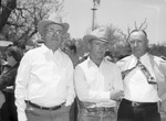 Watt Reynolds, Albany open house. Shown standing from left to right are, Joe Matthews, Albany, Texas; Watt Matthews and Watt Reynolds. All three men are wearing button down shirts tucked inside their trousers and belts. Mr. Joe Matthews and Mr. Watt Matthews are wearing hats. Mr. Joe Matthews is wearing eyeglasses. Mr. Reynolds is wearing a coat, tie and eyeglasses.