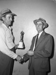 The Fort Worth Star-Telegram Junior is highlighting several star employees in a recent addition of their employee centric newspaper. Shaking hands, left to right are Joe Cochran and Red Grimes. Mr. Cochran is presenting the Pressman's Cup. He is dressed in a hat, button-up shirt and trousers. Mr. Grimes, the 1944 Star-Telegram golf champion, is accepting the trophy. He is wearing a straw hat and a suit. Published in the Fort Worth Star-Telegram Junior, June 30, 1944.