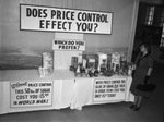 Mrs. T. J. W. Shoemaker. Mrs. Shoemaker standing in front of table with a sign that says "Does price control effect you?". There are various food items on the table.