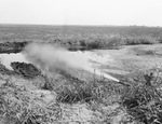 Deep production possibilities have been opened in eastern Fisher County at the Northern Ordnance, Inc., Number 1-B Howard 180, block 2. Houston & Texas Cental (H&TC) survey, producing from either the Strawn or Palo Pinto lime at 5,585 feet to 5,610 feet. At the drilling in of the discovery is shown oil flowing into pits in the field. Published in the Fort Worth Star-Telegram morning edition, July 23, 1944.