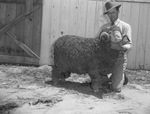 West Cross Timbers Sheep and Goat Raisers Association at Mineral Wells, Texas sale and show. George Johnson of the 'Firm of H. C. and G. H. Johnson', Brady, Texas, with his champion Delaine ram. Mr. Johnson is seen to be kneeling down next to the ram. He is wearing a button down shirt, a tie and a hat.
