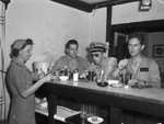 Red Cross Canteen at Municipal Airport for Navy Ferry pilots, crews, etc. Mrs. Aline Woods serves, left to right, Ensign Loyal M. Bears, Shelby, Michigan; Lieutenant (junior grade) Jonh B. Huff, and Ensign R. W. Carlton, Wellesley, Massachusetts. The three men are sitting at a bar with glasses and various utensils in front of them. Mrs. Woods stands on the other side of the bar wearing a server uniform and looking down. The three men are all in military uniforms.