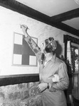 Red Cross Canteen at Municipal Airport for Navy Ferry pilots, crews, etc. Ensign John C. Gorman, Wellesley, Massachusetts. Ensign Gorman is reaching his arm up to write something on a wall. He is wearing a flight helmet and a flight uniform. He is holding a roll of paper in his other arm.