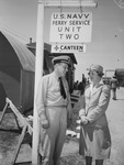 Red Cross Canteen at Municipal Airport for Navy Ferry pilots, crews, etc. Lieutenant J. M. Tuggle, commanding officer of airport's Navy Ferry Unit, and Mrs. Oliver Shannon, canteen chairman. The duo are outside standing under a sign that says "U.S. Navy Ferry Service Unit Two. Canteen". Both Lieutenant Tuggle and Mrs. Shannon are dressed in military uniforms and smiling at each other.