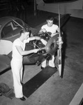 North Texas Agricultural College (NTAC) students are doing their part in the war effort. In the plane repair shop are F. H. Wilson, left and Weldon Dooley. They are dressed in t-shirts and trousers as they work on the propeller of a plane. NTAC turns out engineers, aircraft workers, naval apprentice seaman, and dozens of other trainees at a rapid clip. In the 1920s Dean E. E. Davis recognized the ever increasing role airplanes would play and installed various aeronautical courses in the aeronautics/engineering department. Due to the foresight of Dean Davis, NTAC required no war time conversion and was already prepared with necessary courses, equipment, and projects. North Texas Agricultural College was later renamed The University of Texas at Arlington.
