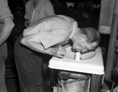 N. D. Petty, new president of the Star-Telegram Employees association, seen drinking water from a fountain.