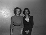Left to right, are, Margie Sprinkle and Betty Hartley. Mrs. Sprinkle is wearing a dress with buttons. She is also wearing a wrist watch on her left wrist. Mrs. Hartley is wearing a stripped long sleeve dress with a ruffled inner. She is also wearing a ring on both hands. Both women are standing in front of a bare wall and smiling.